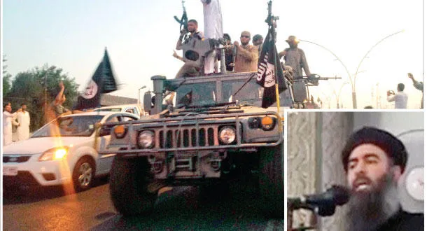 أبو بكر البغدادي يعلن خلافته في جامع النوري وسط الموصل، و عناصر من تنظيم «داعش» لدى دخولهم مدينة الموصل في يونيو الماضي (أ.ب)