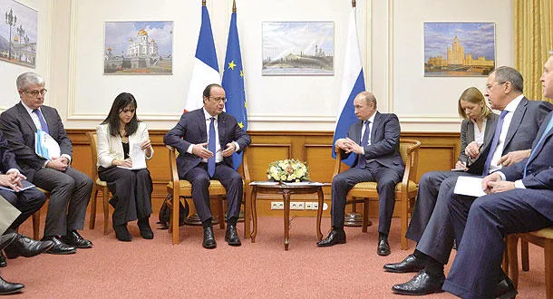 في زيارة مفاجئة ودون سابق إعلان، وصل الرئيس الفرنسي فرنسوا هولاند إلى موسكو أمس للقاء نظيره الروسي فلاديمير بوتين، بعد زيارة لكازاخستان استمرت يومين. وقال بوتين في ختام لقاء استغرق ساعتين إن «فرنسا وروسيا تؤيدان نهاية حمام الدم فورا» في شرق أوكرانيا، مشيدا بـ«المحادثات البناءة جدا» بين الطرفين.