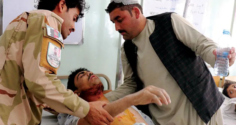 أحد جرحى التفجير الانتحاري في قندهار بعد نقله إلى المستشفى للعلاج أمس (إ.ب.أ)
