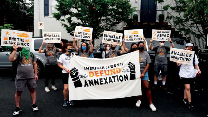 مظاهرة في واشنطن ليهود يحملون لافتات تطالب بعدم تمويل خطة ضم الضفة (د.ب.أ)