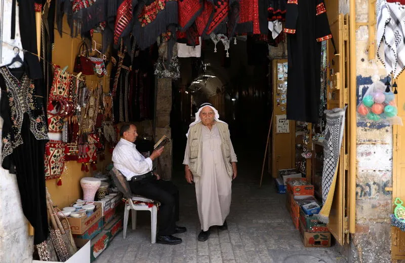 رجل يمشي وآخر يجلس في البلدة القديمة بمدينة الخليل بالضفة الغربية (إ.ب.أ)