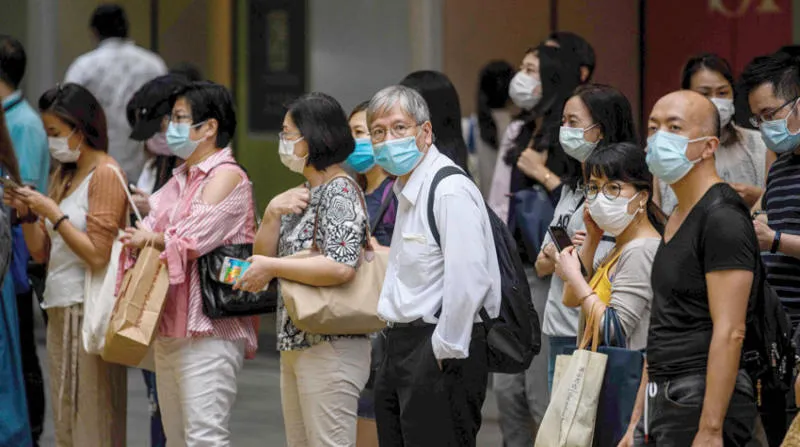 مشاة يرتدون كمامات في هونغ كونغ التي تشهد ارتفاعا جديدا في إصابات كورونا (أ.ف.ب)