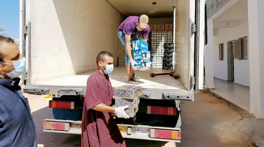 توزيع مواد غذائية على مواطني منطقة كعام المعزولة بسبب تفشي «كورونا» في غرب ليبيا (بلدية زليتن)