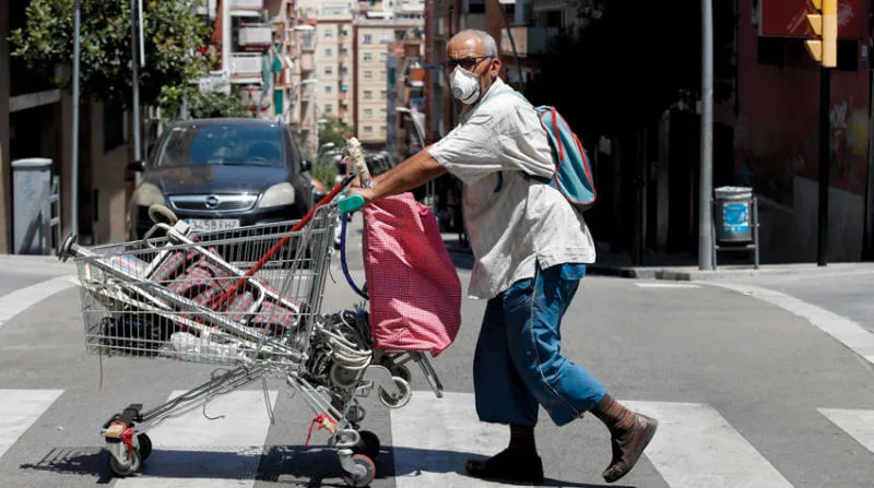 رجل يدفع عربة تسوّق في منطقة توراسا قرب برشلونة أمس (إ.ب.أ)