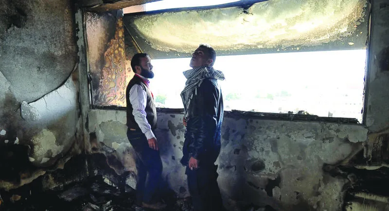 عاملان في المركز الطبي في بنغازي يتفقدان الخسائر الناجمة عن قصف تعرض له المبنى امس مما ادى الى اندلاع حريق فيه ( رويترز )