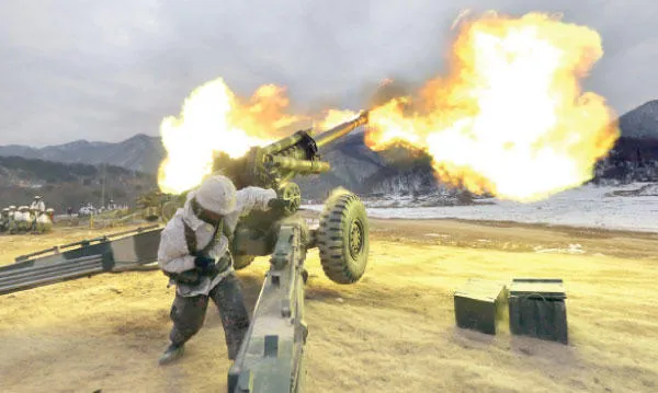 قوات كورية جنوبية تتدرب على المدفعية في منطقة ييونشيون التابعة لإقليم كيونغ كي، أمس. ومن المقرر إجراء مناورات عسكرية كورية جنوبية - أميركية الشهر المقبل مما أثار قلق كوريا الشمالية (إ.ب.أ)