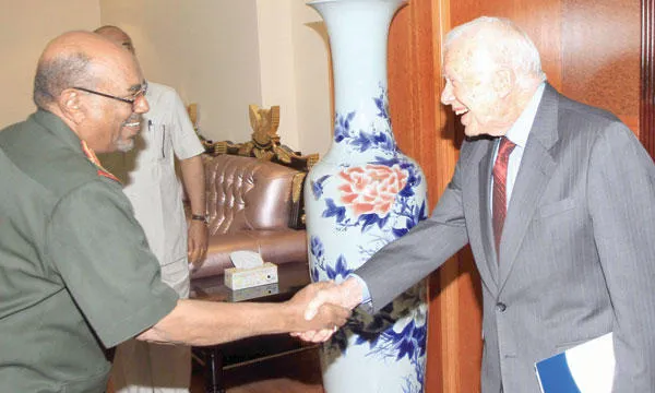 الرئيس السوداني عمر البشير لدى استقباله الرئيس الأميركي الأسبق جيمي كارتر وزوجته روزالين قبل ثلاثة أيام (أ.ف.ب)