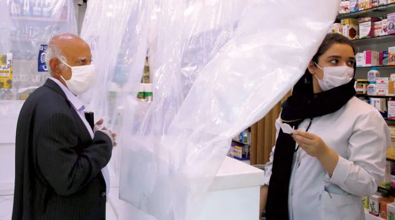 صيدلانية تتحدث إلى رجل في طهران التي تشكو من عقوبات واشنطن وسط أزمة وباء «كورونا» الحادة في إيران (إ.ب.أ)