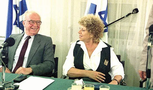 شولاميت ألوني مع إسحق رابين في لقطة عام 1993 حين كانت وزيرة التعليم في حكومته (أ.ب)