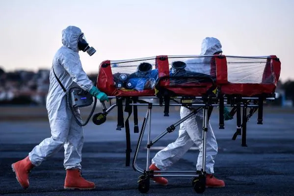 أعضاء فرقة عسكرية للدفاع المدني ينقلون مرضى كورونا في مطار بامبولها بالبرازيل (ا.ف.ب)
