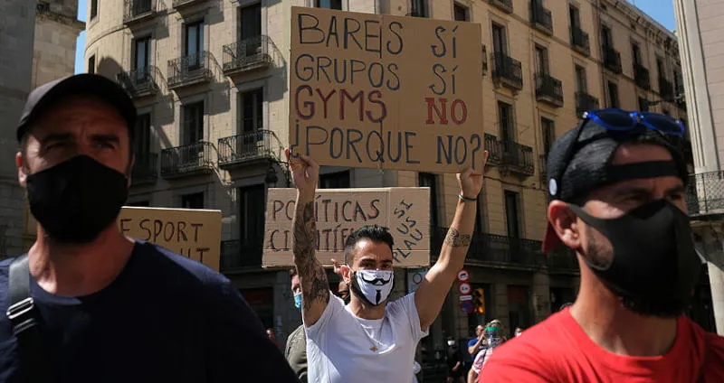 جانب من مظاهرة نظّمها موظفو الصالات الرياضية المغلقة في برشلونة أول من أمس (رويترز)