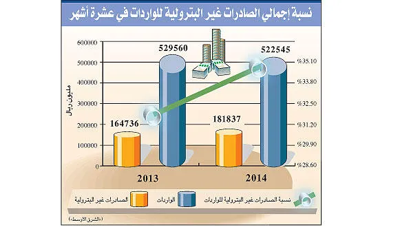 وأظهرت بيانات مصلحة الإحصاء السعودية أن نسبة قيمة الصادرات غير البترولية من قيمة ورادات المملكة قد انخفضت في أكتوبر 2014، لتصل إلى 34.8 في المائة، مقارنة مع 39.4 في المائة خلال نفس الفترة من العام الماضي.