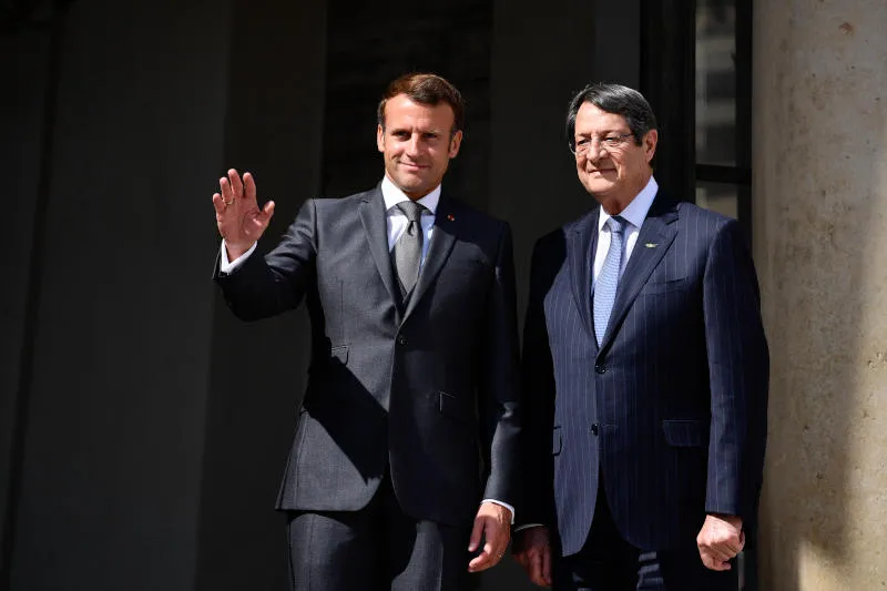 الرئيس الفرنسي إيمانويل ماكرون مع نظيره القبرصي نيكوس أناستاسيادس (د.ب.أ)