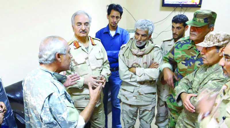 اللواء حفتر يتحدث مع قادة عسكريين في بنغازي يوم 3 ديسمبر الحالي (رويترز)