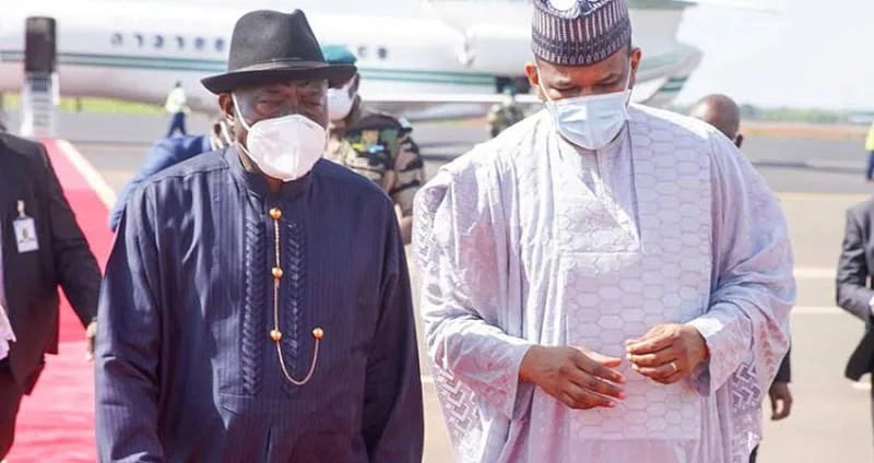 رئيس وزراء مالي باوبو سيسي مع الرئيس النيجيري السابق غودلاك جوناثون الذي يقود الوساطة (رويترز)