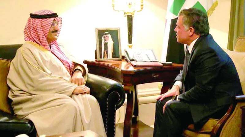 العاهل الأردني الملك عبد الله الثاني لدى استقباله الأمير خالد بن بندر في عمان أمس (بترا)
