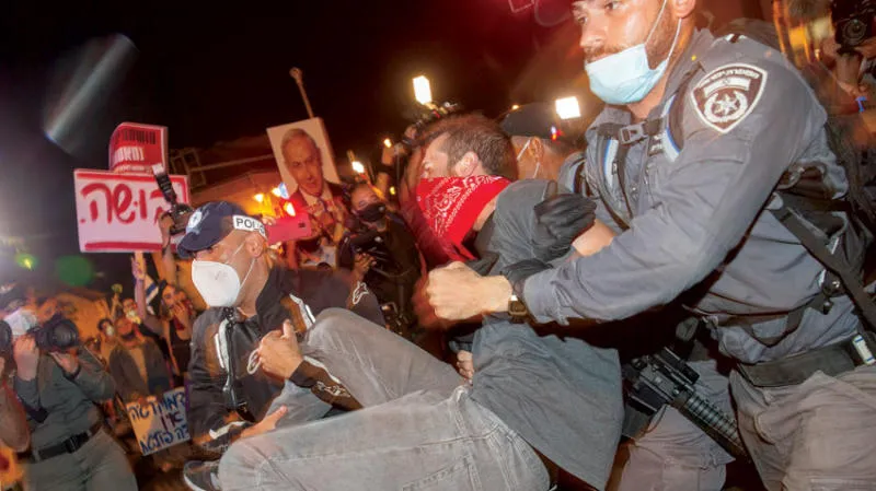 الشرطة تعتقل متظاهرين إسرائيليين ضد رئيس الوزراء نتنياهو أمام منزله في القدس (أ.ب)