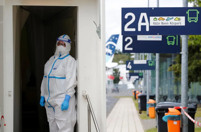طبيب في مركز فحص المسافرين بمطار كولونيا في ألمانيا (رويترز)