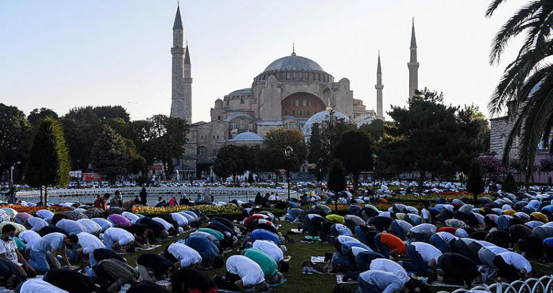 مسلمون يؤدون صلاة عيد الأضحى في الساحات المحيطة بـ«آيا صوفيا» في إسطنبول بعد تحويله إلى مسجد (أ.ف.ب)
