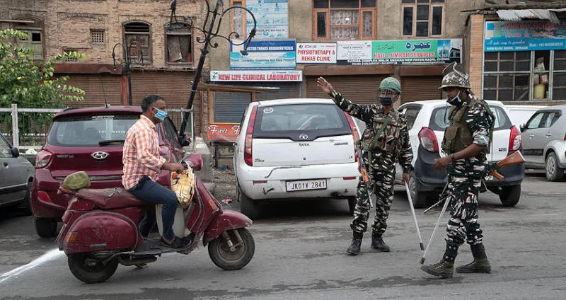 عسكريون يراقبون الوضع في سريناغار بإقليم كشمير في أول أيام عيد الأضحى في إطار تدابير منع انتشار فيروس «كوفيد - 19» (أ.ب)