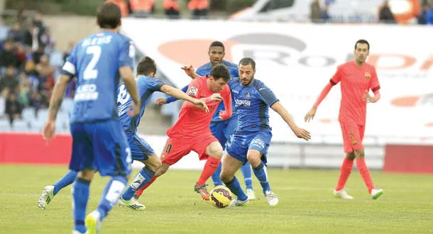 مدافعو خيتافي يمنعون ميسي من العبور في محاولات تكررت كثيرا (إ.ب.أ)
