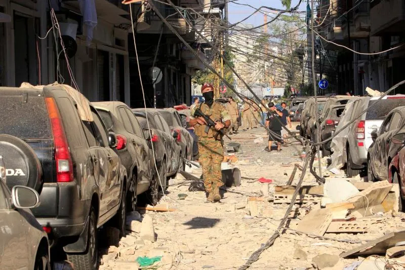 جندي لبناني يسير وسط دمار في شارع قريب من موقع انفجار مرفأ بيروت (رويترز)