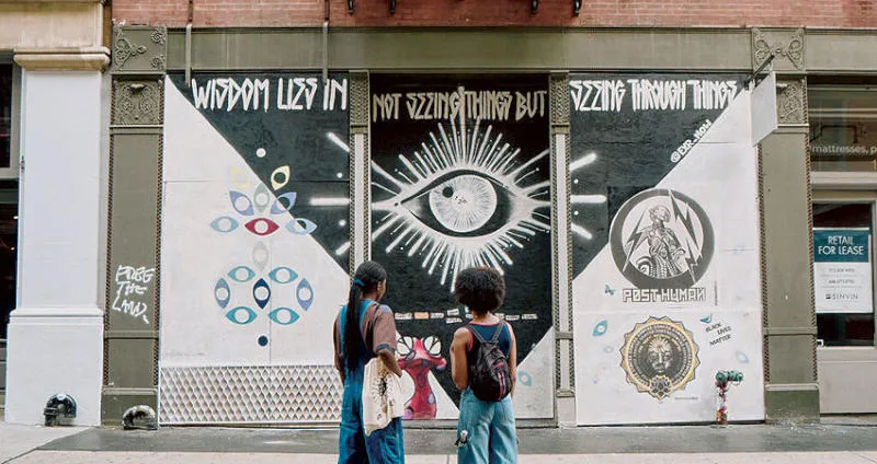 ومن المهم في السياق ذاته الإشارة إلى أن هذه التصاوير الكهفية العتيقة والقصص المتنوعة التي تتلوها لا تختلف كثيراً عن المنتديات الفنية التي نشهدها في العصر الحديث؛ ونقصد بذلك فنون الشارع التي تزين واجهات المتاجر والمحال في مدينة نيويورك راهناً؛ إذ إنها تسرد لنا قصة واقعية تدور حول الحقائق السياسية الراهنة المشتركة، وعن الأشخاص الذين نعيش ونتعايش معهم ضمن المجال الاجتماعي نفسه، فضلاً عن الأنماط والأساليب التي تتمازج وتتقاطع من خلالها مختلف قصصنا المتنوعة ومصائرنا المختلفة. إذا نزلت للمشي في شوارع سوهو، أو أزقة الجانب الشرقي السفلي من مدينة نيويورك، وعبرت من خلال الطرق المزدحمة بالبشر والسيارات في بروكلين، تماماً كما كنت أفعل في الأسابيع القليلة الماضية، فسوف تشاهد كثيراً من هذه الرموز، والإشارات، والعلامات، والتي ربما تدفعك إلى التساؤل عن فحواها والغرض الحقيقي من وجودها. غير أن الأمر الذي صار جلياً للغاية من وجهة نظري هو أنه عبر الألفيات التي تفصل بين تصاوير الكهوف العتيقة ومقتل الضحية جورج فلويد، كانت الرسائل التي نشترك في البعث بها ونتشاركها فيما بيننا - والتي تعكس مختلف الظروف الاجتماعية والخلفيات السياسية من ورائها - قد باتت أكثراً تعقيداً.