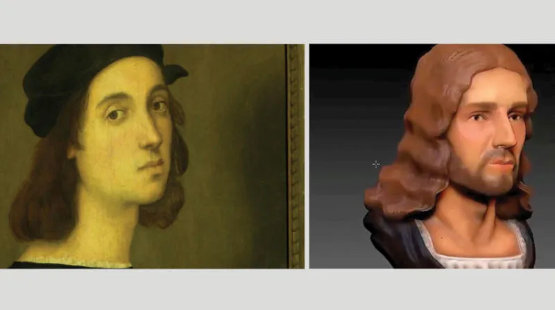 صورة ثلاثية الأبعاد أعدها باحثون لوجه رفائيل (يمين).. وكما رسم نفسه (رويترز)
