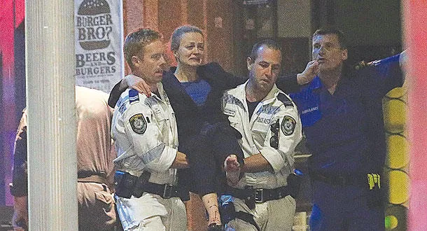 رجلا إسعاف ينقلان رهينة مصابة بعد مداهمة الشرطة لمقهى سيدني (أ.ب)