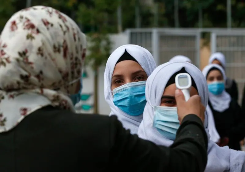 عاملة صحية تقيس حرارة طالبات قبل دخولهن مدرسة في الخليل (رويترز)