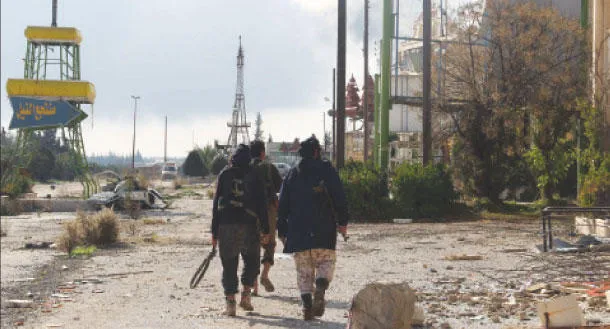 مقاتلون يسيرون باسترخاء في معسكر الحامدية الذي استولت عليه المعارضة أول من أمس هو ومعسكر وادي الضيف في إدلب شمال سوريا (رويترز)