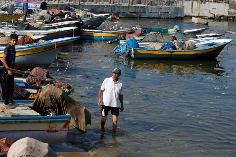 صياد يمشي وسط مراكب في ميناء غزة (رويترز)