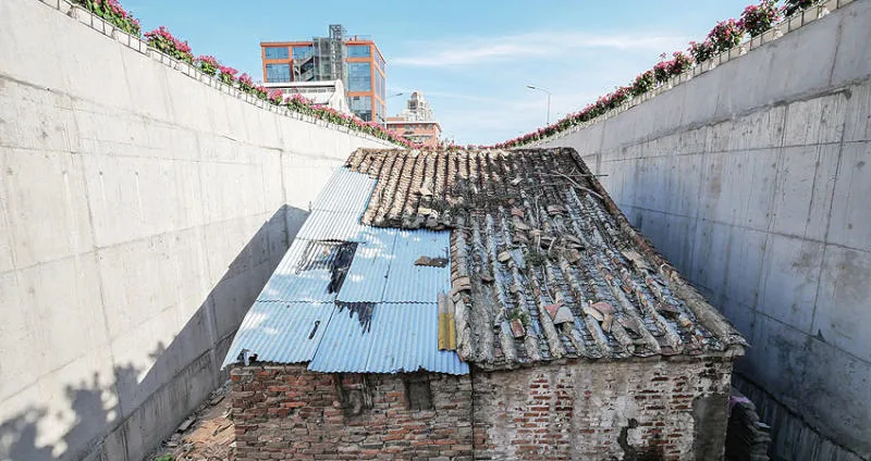 البيت الذي رفضت صاحبته مغادرته بين حارتين من الطريق السريعة بمدينة غوانغزو الصينية (د.ب.أ)