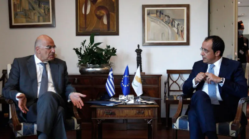 وزيرا خارجية اليونان وقبرص في نيقوسيا أمس خلال محادثات لمناقشة التصعيد التركي (أ.ب)
