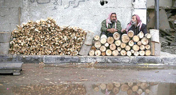 رجلان من دوما المحاصرة في الغوطة الشرقية بريف دمشق يبيعان الخشب الذي يقتطع من الأشجار المحيطة (رويترز)