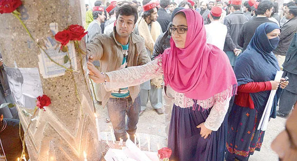 ناشطون من المجتمع المدني الباكستاني يضعون وردا لتذكر ضحايا المجزرة في مدينة بيشاور أمس (أ.ف.ب)