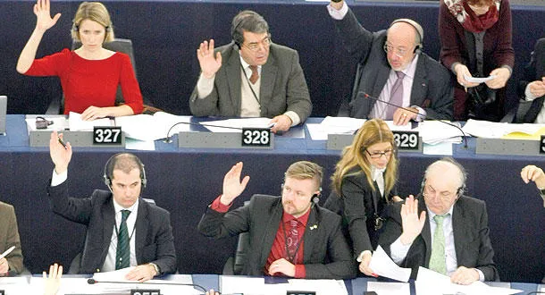 أعضاء البرلمان الأوروبي في استراسبورغ أثناء التصويت على قرار الاعتراف بالدولة الفلسطينية أمس (أ.ب)