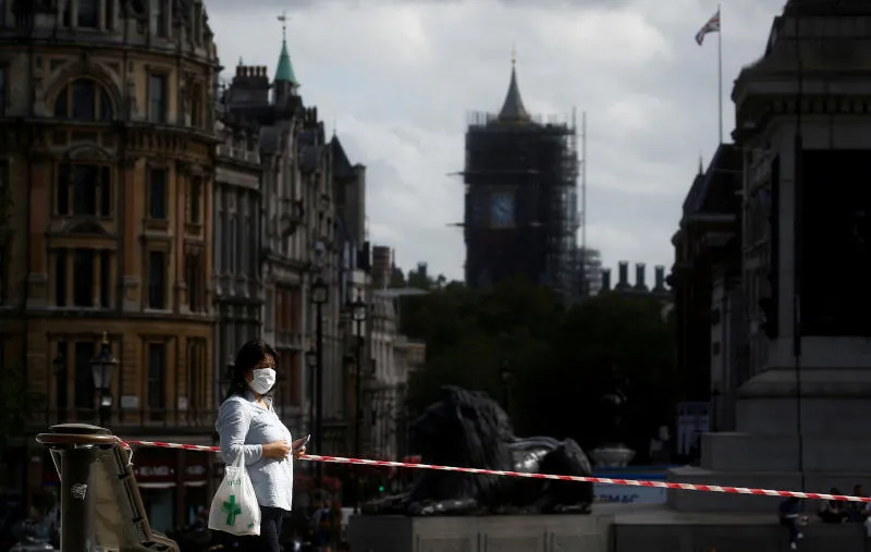 سيدة ترتدي قناعاً واقياً في لندن (رويترز)