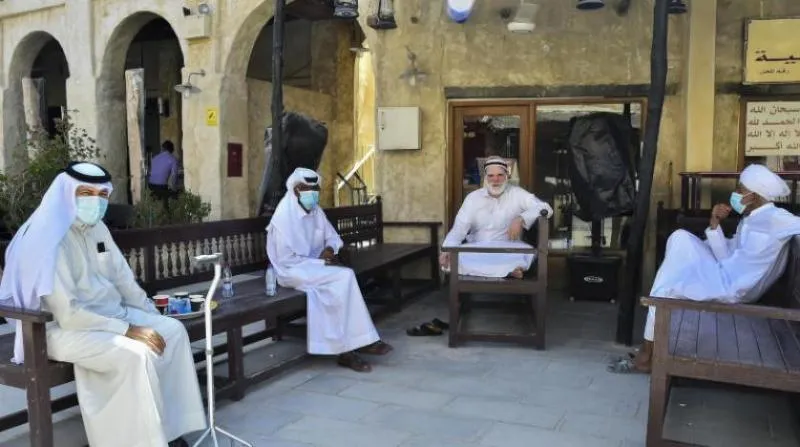 قطريون يجلسون خارج أحد المطاعم في «سوق واقف» بالدوحة (أ.ف.ب)