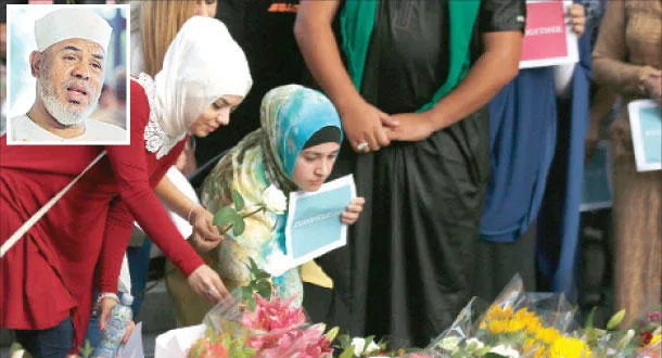 الشيخ تاج الدين الهلالي، و عدد من أبناء الجالية المسلمة يضعون باقات من الزهور بالقرب من مقهى سيدني بعد العملية الإرهابية الثلاثاء الماضي (رويترز)