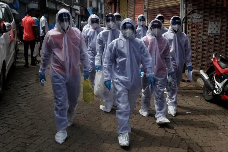عمال الرعاية الصحية يرتدون معدات الحماية الشخصية في معسكر فحص لمرض فيروس «كورونا» في مومباي (رويترز)