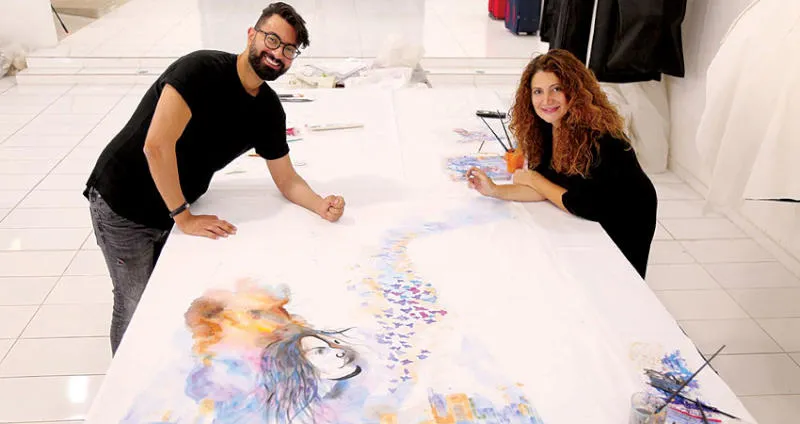 المصمم نجا سعادة والرسامة أدريانا الحاج خلال تنفيذهما فستان «أنا بيروت»