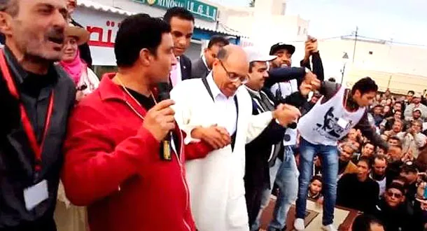 المرزوقي الذي كان يرتدي زيا تونسيا تقليديا فوق زيه العصري، تناغم مع الأغنية التي تقول كلماتها «ما أحلى القعده على الميه.. وما أحلى الثورة التونسية». بينما كان أحد الشباب يتولى الإنعاش لإثارة حماس الجماهير.
