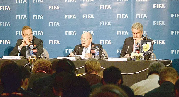 بلاتر (وسط) خلال المؤتمر الصحفي الذي أعلن فيه قرار نشر تقرير غارسيا (أ.ف.ب)