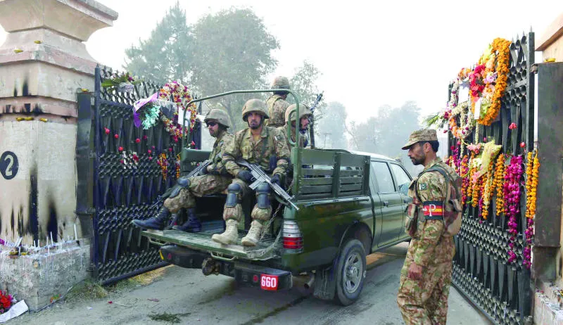 جنود الشرطة الباكستانية أمام مدخل المدرسة العسكرية في بيشاور التي هاجمتها طالبان وأدت إلى مقتل أكثر من 130 تلميذا الأسبوع الماضي (أ.ف.ب)