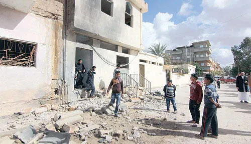 ليبيون يقفون قرب مسجد طالته أضرار إثر انفجار وقع في بنغازي أمس (رويترز)