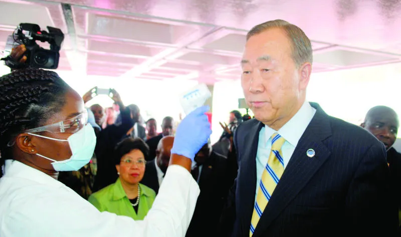 بان كي مون يخضع لقياس درجة حرارته أثناء وصوله إلى «مطار روبرتس الدولي» بالعاصمة الليبيرية أمس (رويترز)