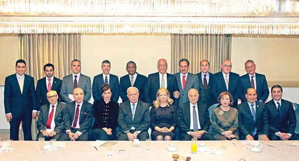 عقدت بعثة جامعة الدول العربية اجتماعا الأربعاء في فندق «دورشستر» بالعاصمة البريطانية على شرف د. نبيل العربي أمين عام جامعة الدول العربية ود. رياض المالكي وزير خارجية فلسطين وصائب عريقات رئيس لجنة المفاوضات الفلسطينية، لإطلاع السفراء العرب لدى المملكة المتحدة على آخر مستجدات القضايا العربية على الساحة الدولية بعد لقائهم مع وزير الخارجية البريطانية فيليب هاموند ووزير الخارجية الأميركي جون كيري (تصوير: هامبار ناركيزيان)