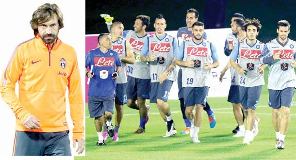 جانب من تدريبات نابولي في الدوحة (أ.ف.ب) - بيرلو خلال استعدادات اليوفي لمباراة السوبر الإيطالي غدا (أ.ف.ب)