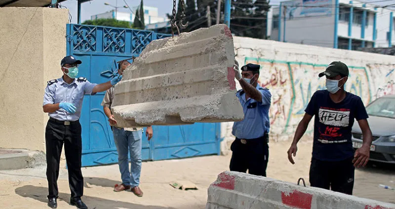 شرطة غزة تغلق شارعا في مخيم جباليا بعد قرار إغلاق القطاع بسبب كورونا (رويترز)